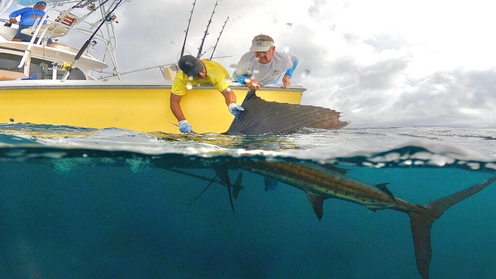 World famous Tropic Star Lodge held its Annual Billfish Conservation tournament last week in Pinas Bay Panama. Prior to the torneo, team members from the Guy Harvey Ocean Foundation were part of a research group tagging black marlin, blue marlin, sailfish and dorado (dolphin fish or mahi) from the lodge. This is part of a long term study to better track these ecologically important species of gamefish in the Eastern Tropical Pacific. Sustainable catch and release sport fishing is a major player in the regions ecotourism sector. Ryan Logan, a PhD student (Nova Southeastern University) was leading the tagging project brought 32 PAT tags to go on billfish and 6 SPOT tags for silky sharks. Guy Harvey, Jessica Harvey, Steve Roden and Chris Gough were assisting with catching, tagging, data recording and filming released fish.