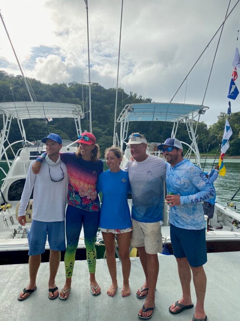 As the research work continued, Jessica remained with the tagging team and Palm Beach angler Gina Zeitlin joined Guy and Chris on team “Los Bamofos” to take part in the torneo. There were three private boats, and ten TSL Bertram boats fishing this year with teams from Canada, USA, Cayman, and Panama. Day 1, Sunday November 21 began with Fishing Director Richard White launching a Bimini start out of the bay. The boats spread out to the south and west to search for billfish. On “Miss Scandia” with Captain Gavilan, marinero Ricardo, in the morning Gina and Guy each bagged sailfish fishing around flotsam to get points on the board. Several other boats caught sails (100 points) and three boats hooked big Pacific blue marlin (300 points) while trolling lures. One boat, a 75 foot Scarborough, “Sea Weez” captained by legendary Aussie skipper Ross Finlayson, hooked a really big marlin, judging from the amount of spray it kicked up each time it jumped. They fought the marlin on 50# line for 80 minutes before getting the leader, calling it 800#, tagged and released with a PAT archival tag.